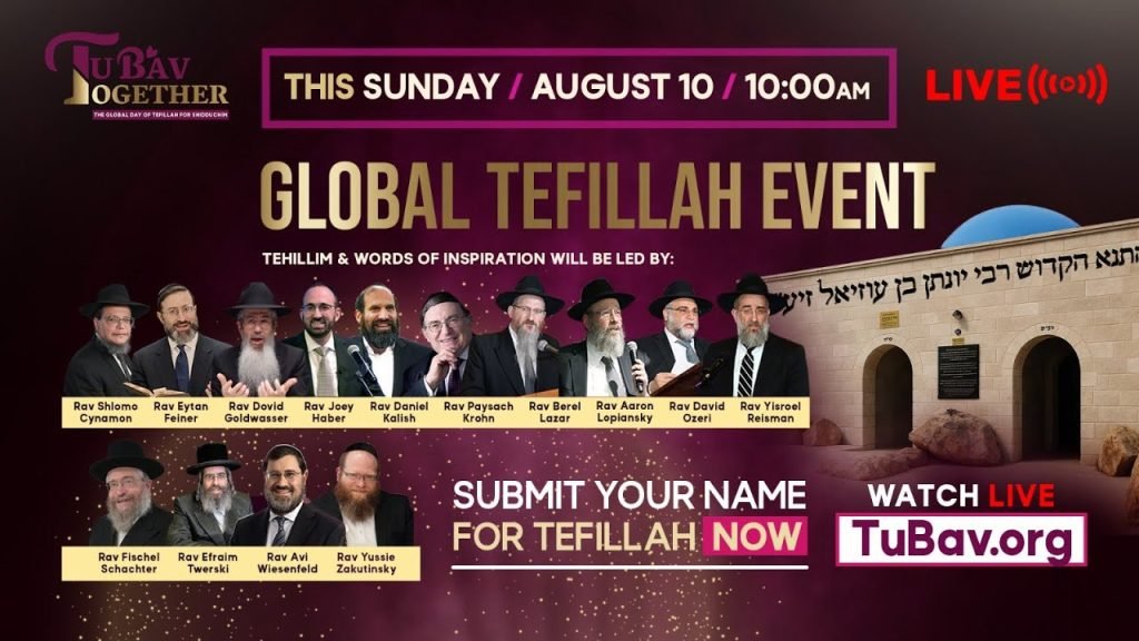 LIVE: “Global Tefillah” with Gedolim & Rabbonim – Sunday August 10th 10AM